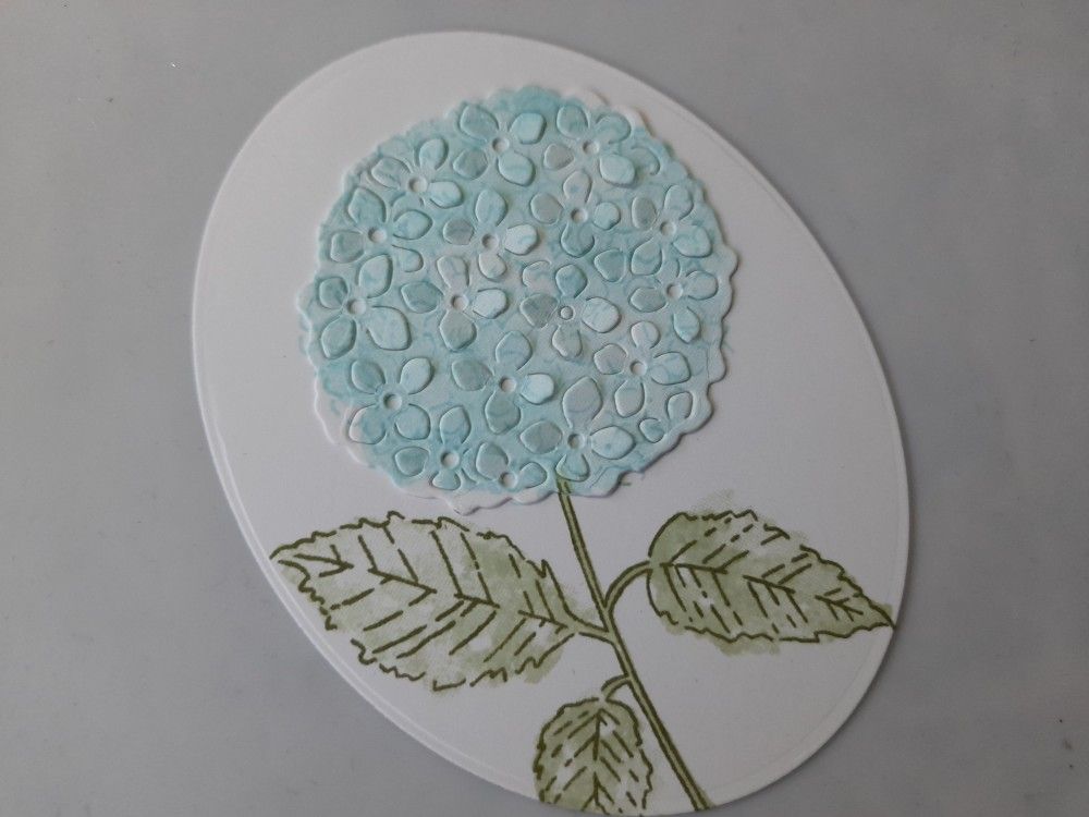 Next was to die cut an oval of white card and then stamp the hydrangea onto it. I used ‘aqua fusion’ again for the flowerhead and ‘avocado’ for the leaves & stem outline. As the Artistry ink pad are small squares I was able to do this all directly onto the stamp. I also stamped the flower head onto a separate small piece of white card, and then inked it with ‘aqua fusion’ and the infill stamp, before using the flower die to cut it out. This is a great 3D die, which partly cuts the individual flowers out as well, so you get more dimension to the image. I used the infill stamp to colour the stem and leaves with ‘dry weed’ ink, and then glued the die cut onto the flower.