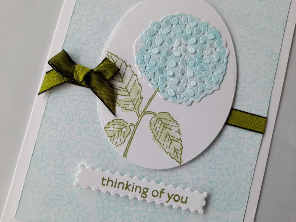 Regular readers of my blog won’t be surprised to know that I’ve done a bit of research into hydrangeas whilst writing this blog. I wanted to know what type of hydrangea this one might be. The common ones seen in the UK are mophead (with large round flowerheads) and lacecap (with flatter heads), which are both originally native to Japan. On reading further though, I think this one is a smooth hydrangea which is native to the US – unsurprising really as Stampin’ Up! is an American company. Here’s some photos – the blue one is a mophead and the white one is a smooth hydrangea. What do you think?
