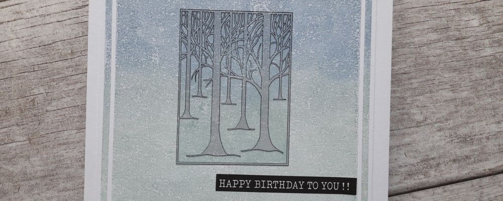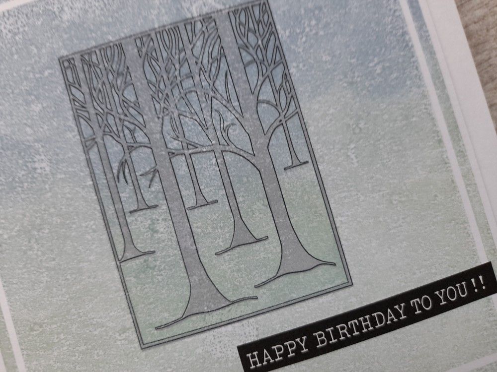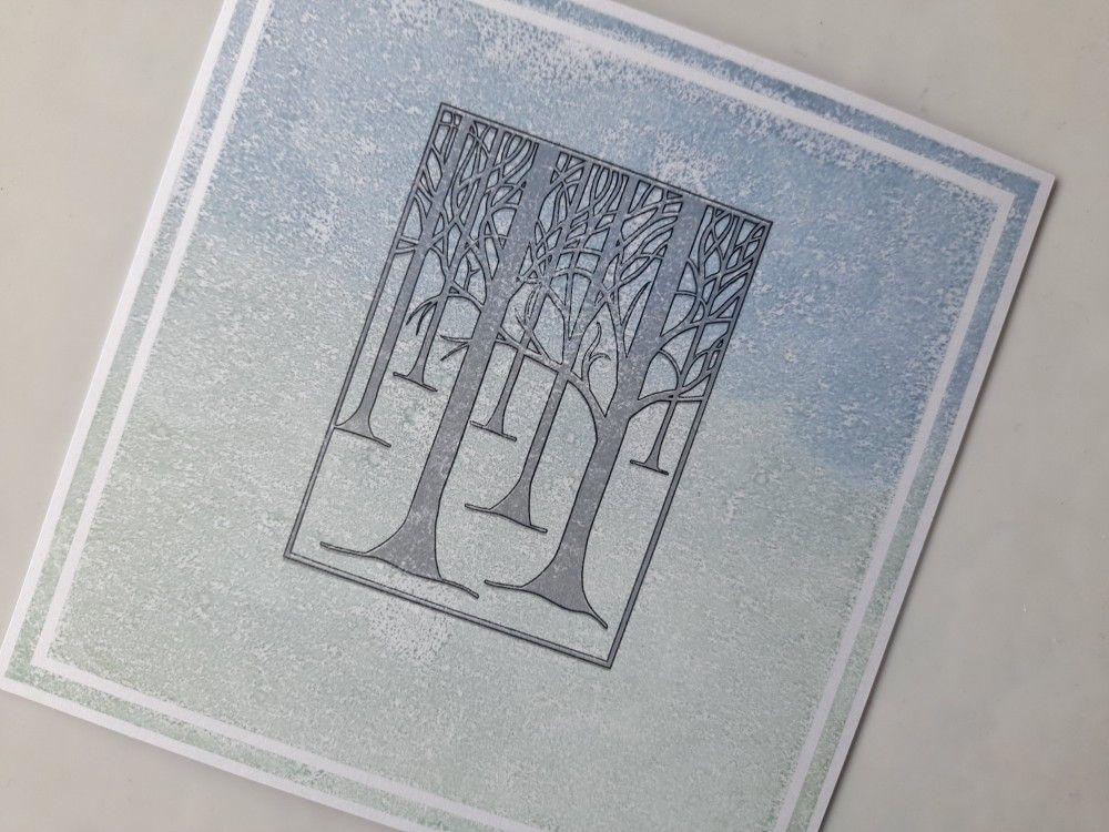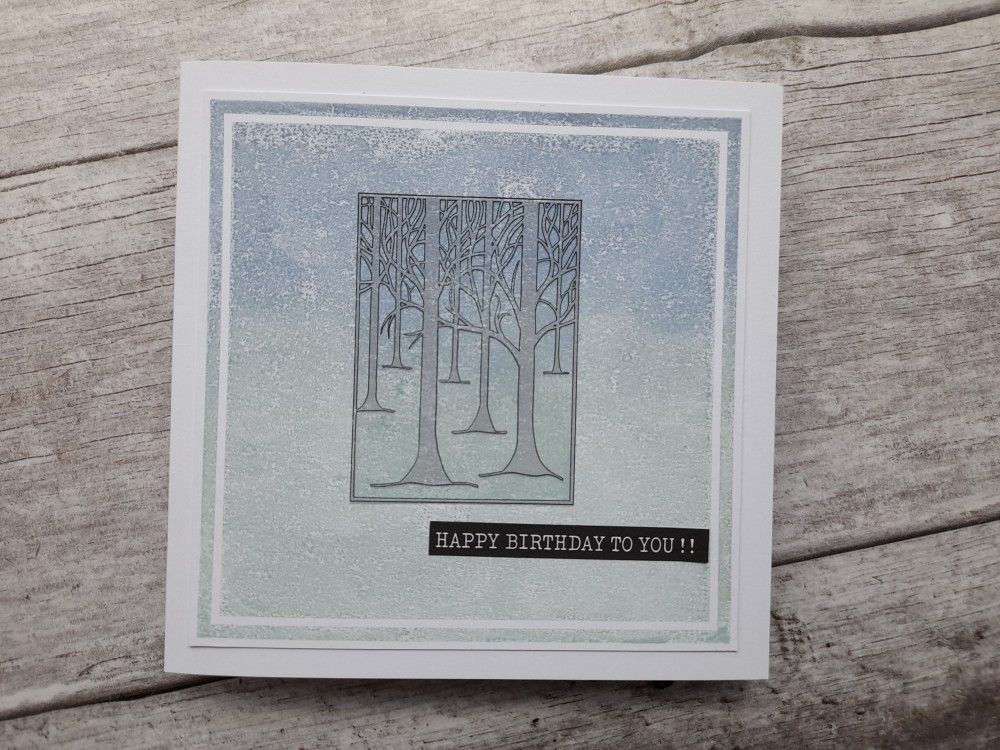 I started by inking up the large background square stamp using Distress Oxides in ‘speckled egg’ and ‘stormy sky’, blending the colour together on the stamp using a sponge. I then spritzed it very lightly with water before stamping it, so I got a bit of texture on the imprint. Next was to position the outline from the ‘treescape’ three way overlay set, which I stamped in black Archival. I then used the infill stamp to fill in the trees using ‘shadow grey’ Archival. At this point I realised I’d forgotten to take any photos, so here’s the progress so far!
