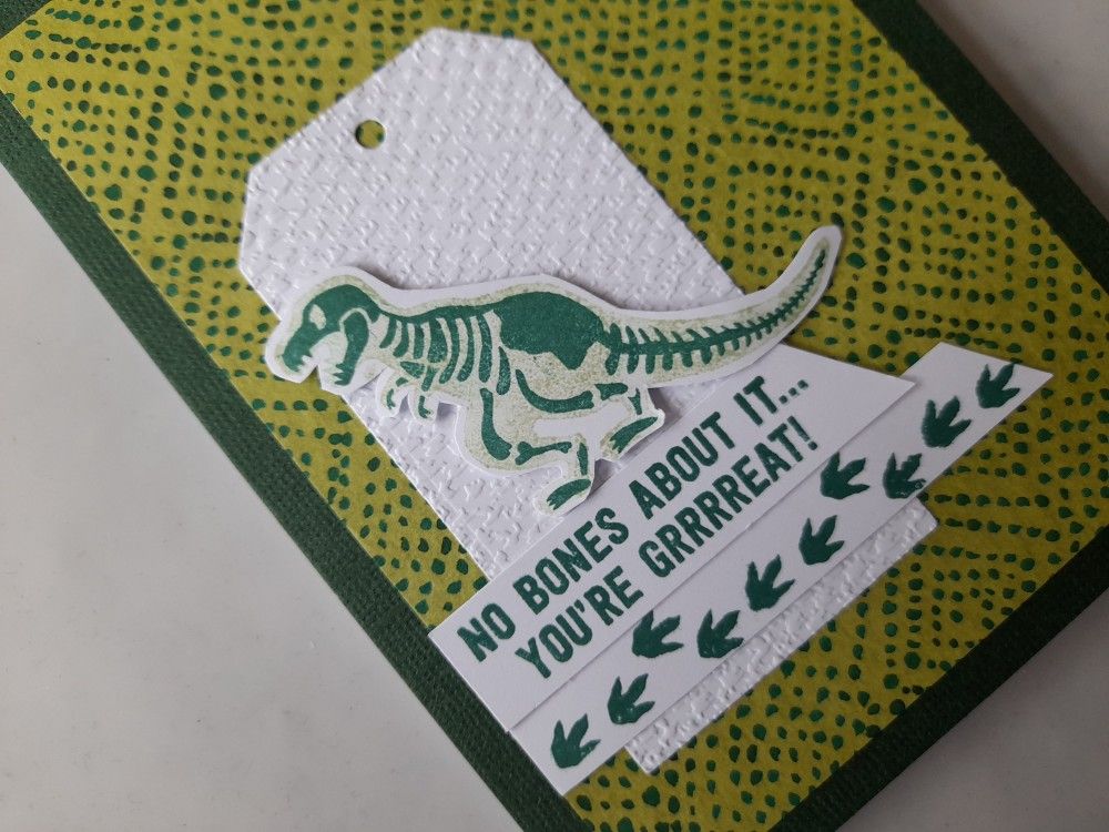 Next was to stamp the T Rex in a light green and add the skeleton in a darker shade before fussy cutting it out. He then sat on top of the sentiment – I used foam pads for added dimension.