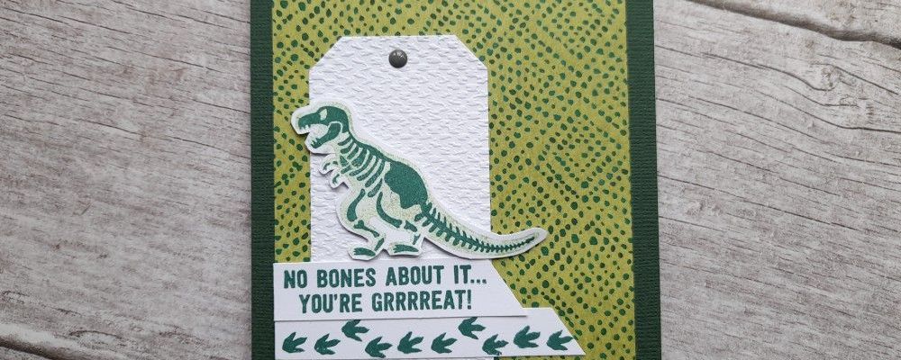 Welcome to my crafty blog. Today’s card is a bit of a blast from the past – on several levels! Obviously dinosaurs are prehistoric, but I’ve used a old retired set from Stampin’ Up!, ‘no bones about it’, and it took me right back to when my eldest son was small and was obsessed with dinosaurs. I think lots of small boys are, but for us any trip out had to include visiting dinosaurs (we spent a lot of time at the National History Museum), and bedtime stories generally involved dinosaur reference books. He could tell you all the Latin names for dinosaurs by the time he went to school!