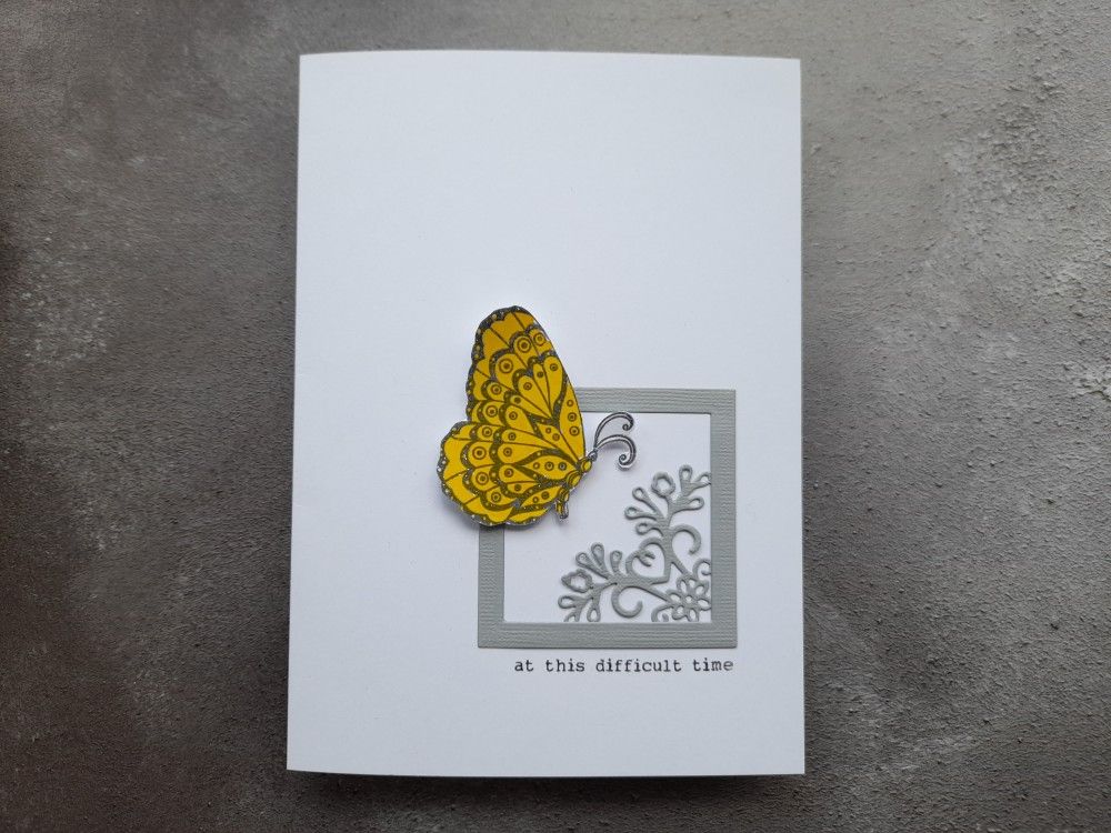 I then stamped one of the butterflies from Clarity’s ‘butterflies and moths’ set in a dark grey (Archival ‘watering can’) and then overstamped it with WOW embossing ink pad so I could add some of their clear sparkle powder to the image. Once heated, I coloured it in with a waterbrush and ‘mustard seed’ Distress Oxide ink. I fussy cut the butterfly and sat it on the top corner of the frame with a foam pad. I managed to take this photo at an angle so you can see the sparkle!