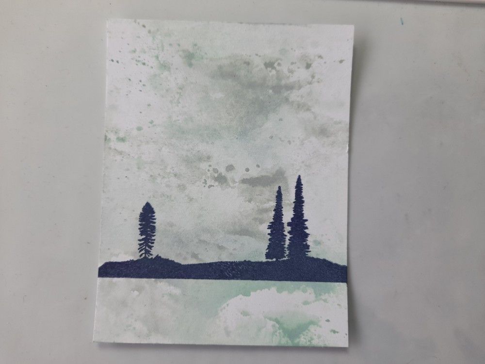 I started with one of my inky mop-up card pieces from a previous project and stamped the trees from the Craft Club set onto it on ‘chipped sapphire’ Distress Oxide.