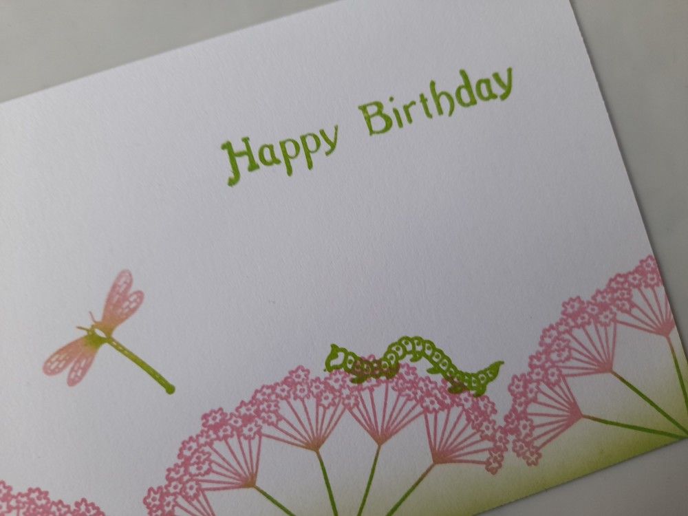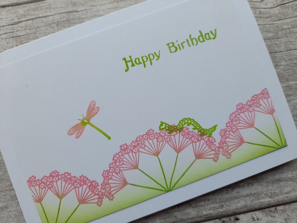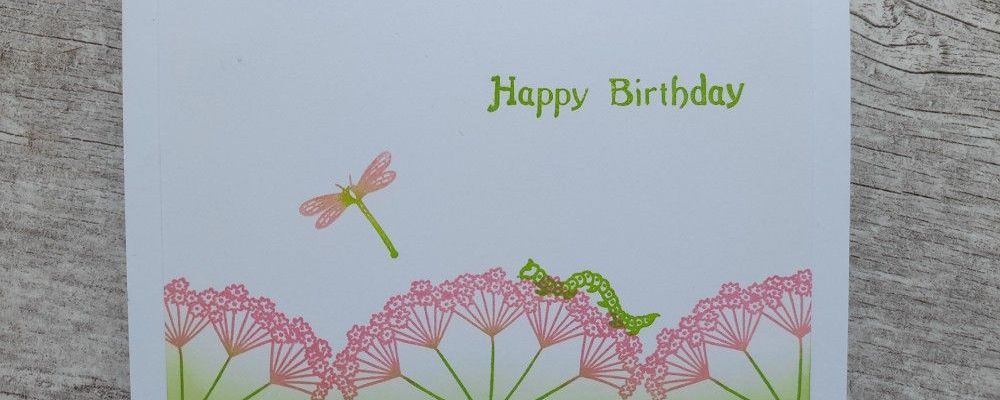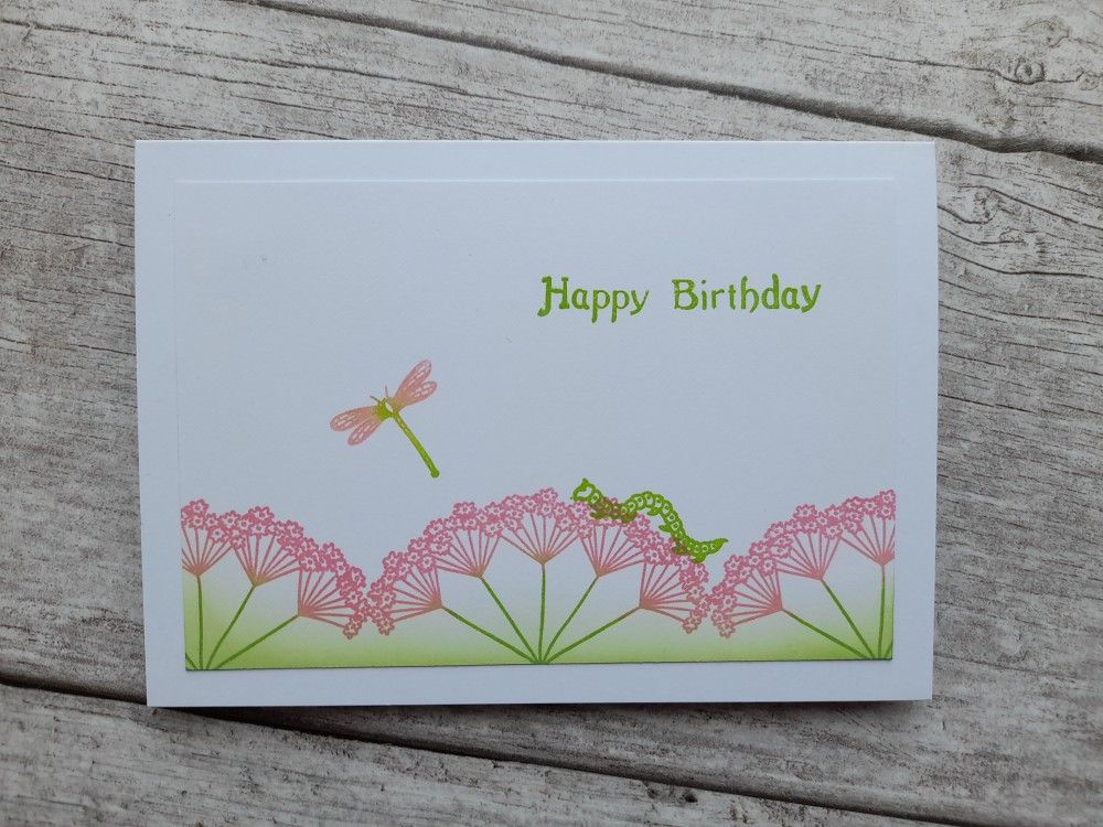 I then added a couple of little bugs from Clarity’s ‘blooming corner and insects’ set, using ‘mowed lawn’ for the caterpillar and blending that and the ‘picked raspberry’ on the stamp for the dragonfly. The sentiment was also stamped in the green.
