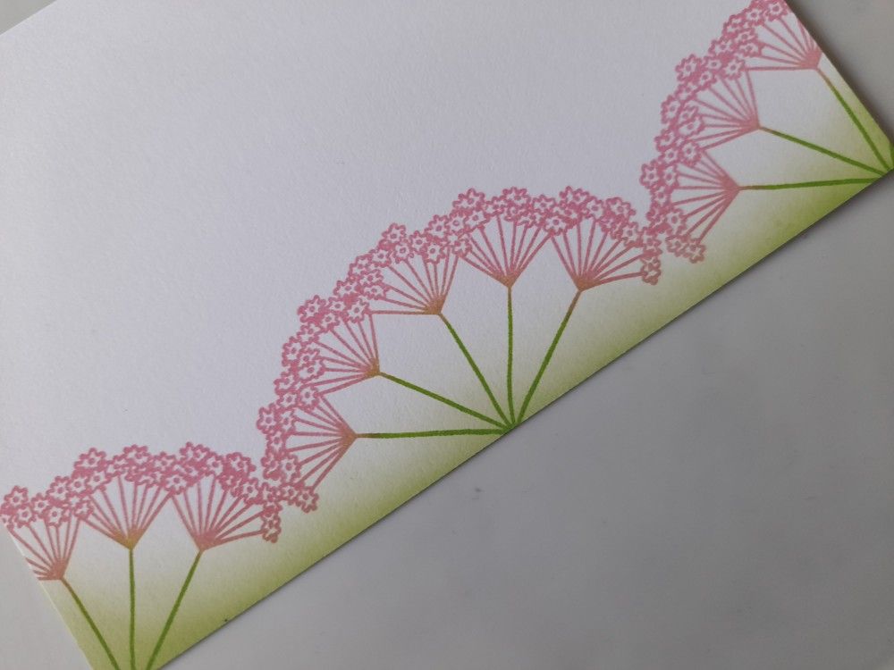 I started with a piece of white card, trimmed down to fit on an A6 card blank. I inked up the stamp with Distress Oxides in ‘mowed lawn’ and ‘picked raspberry’, using a sponge so I could focus the ink on the different parts of the stamp (green on the stems and pink on the flower heads). I stamped the flowers three times along the lower edge of the card, starting from the centre, and then brushed ‘mowed lawn’ along the flower stems.