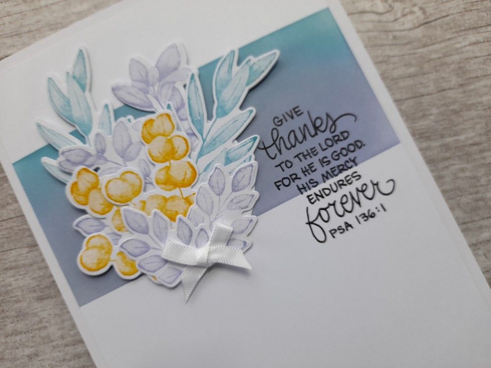 I then cut a piece of white card slightly smaller than a 5×7 card blank and masked off a panel across the upper part. I brushed the ‘broken china’ and ‘shaded lilac’ inks across the panel to pick up the effect of the stripes on Fusion’s inspiration sketch. I stamped the verse from Stampendous’ ‘Bible verses’ in archival black, before attaching the topper to the card front.