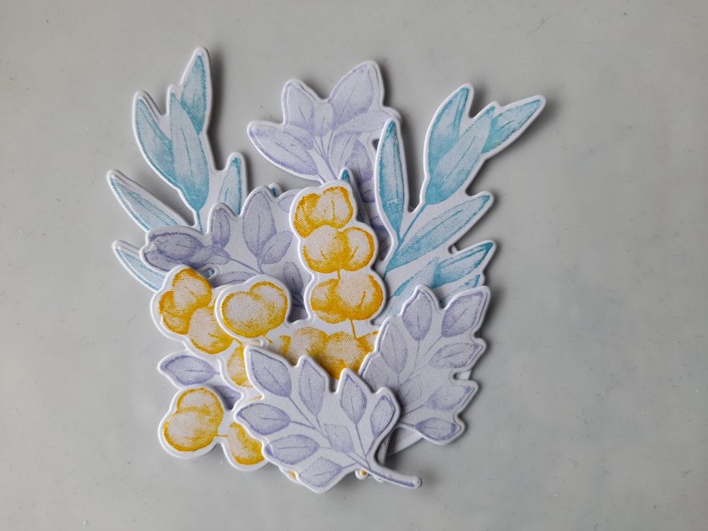 I started by stamping a selection of the leaves and berries from ‘forever fern’, using Distress Oxide in ‘mustard seed’, ‘broken china’ and ‘shaded lilac’ and die cut them all out. I then glued them onto a small circle of card to create the bouquet.