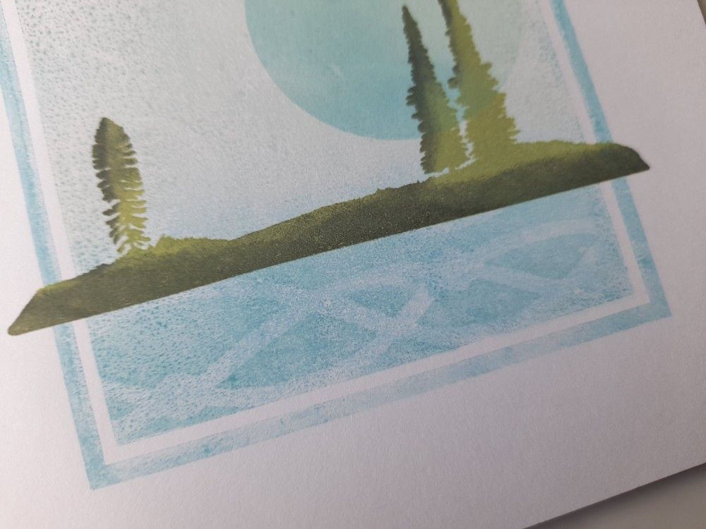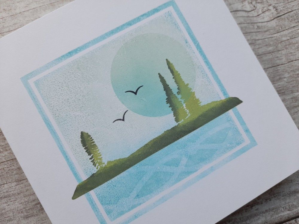 I then inked up the landscape stamp from Clarity’s April craft club using ‘bundled sage’, and added a little ‘black soot’ ink with a sponge to put some shadow on the image. I then stamped that across the lower part of the background image. To be honest, I think I was a bit heavy handed with the black across the land, but it’s too late now! I also masked off the lower part of the stamped background and brushed the ‘broken china’ through Clarity’s ‘seaweed’ stencil, to give the effect of rippling water.