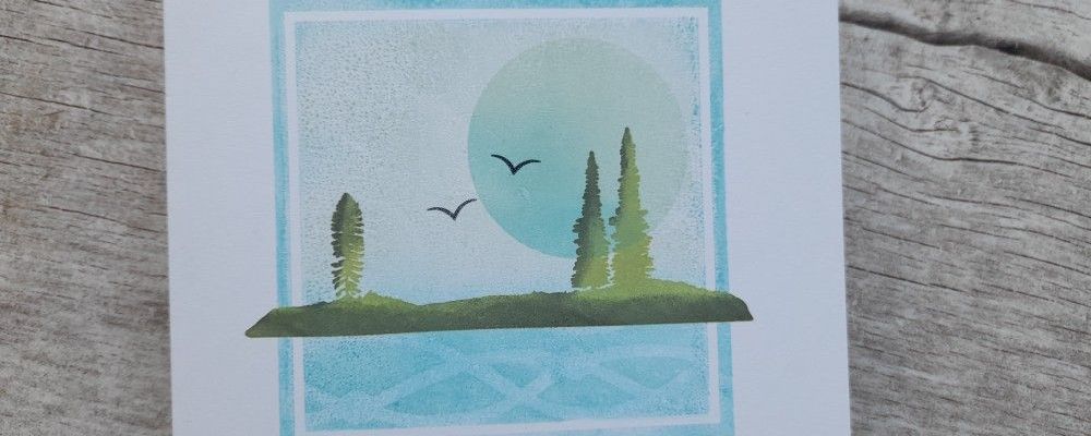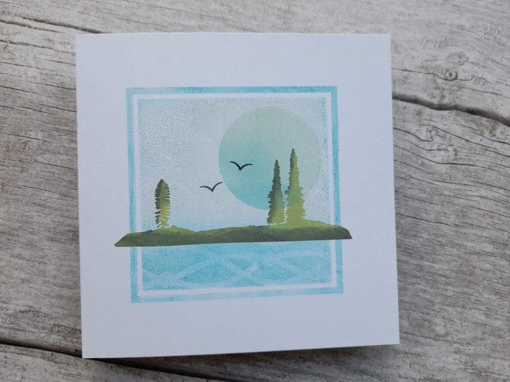 So, onto my card. This is quite a simple one layer card – I love the way you can build up a scene with just stamps and ink. I started with Claritystamp’s small square background stamp and dabbed Distress Oxides in ‘broken china’ and ‘speckled egg’ onto it using a sponge. I went round the edge of the frame with the ‘broken china’ and then stamped it into the centre of a 5×5 card blank. I popped the outer part of a moon mask from Clarity into the image, and blended the two blue inks across it (not sure if it’s now a sun or a moon…!)