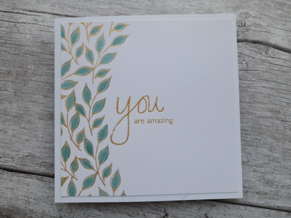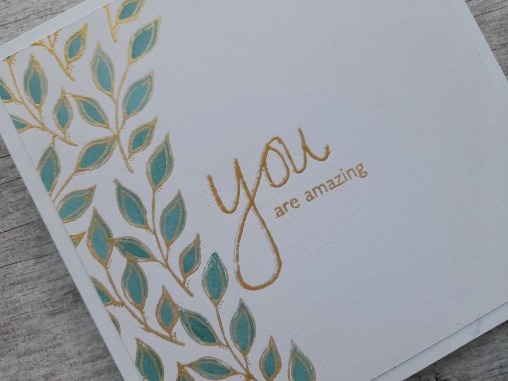 I then coloured the leaves using ‘mellow green’ Artistry ink and a waterbrush. Once dry I stamped the sentiment from Julie’s ‘florals for you’ and again heat embossed it with the ‘gold pearl’.
