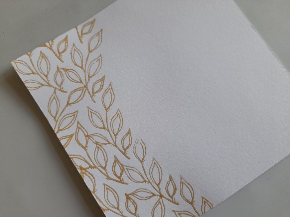 I started with a square of white card and used a plate to draw a curve onto it! That gave me the guideline for the edge of the leaves. I used the small leaf spray from the set and repeat stamped it with WOW clear ink before heat embossing them with ‘gold pearl’ powder ( I did them one at a time).