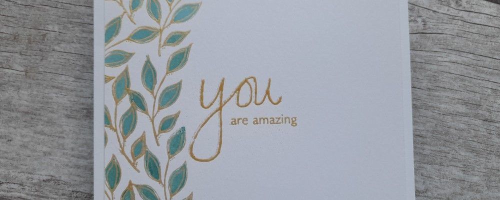 I then coloured the leaves using ‘mellow green’ Artistry ink and a waterbrush. Once dry I stamped the sentiment from Julie’s ‘florals for you’ and again heat embossed it with the ‘gold pearl’.