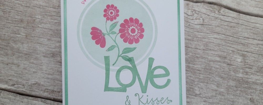 I then inked the infill stamp from the ‘Love – feel good words’ stamp in the ‘evergreen bough’ and added it across the bottom of the circle, together with the ‘& kisses’ from the same set. It was about time I’d used this one, as I bought it a few months ago!