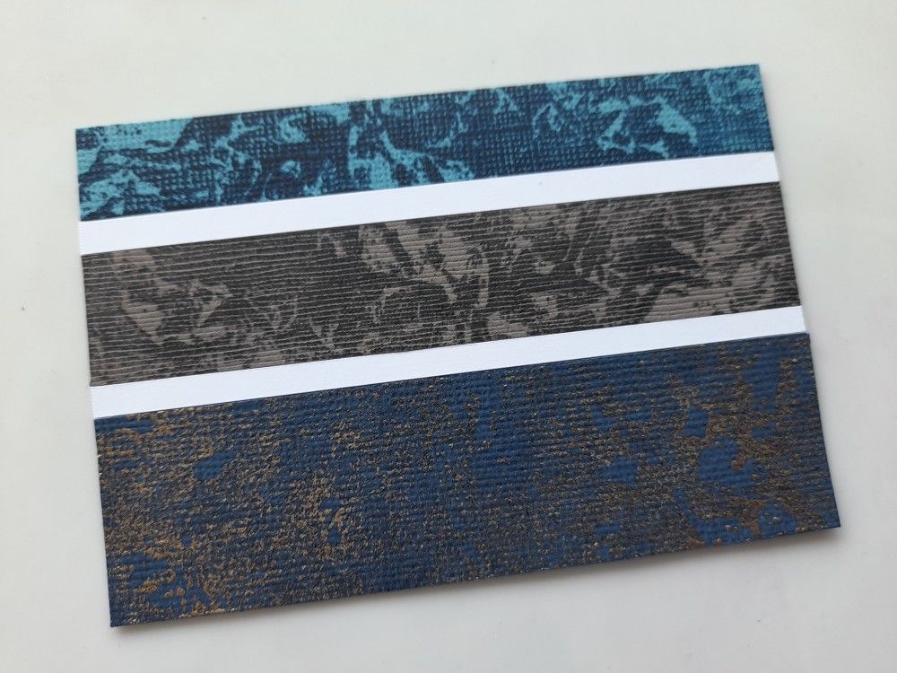 I started with three strips of card in navy, grey & teal and overstamped them using the new ‘scrunch’ background stamp designed by Marion Emberson for WOW. I used navy ink on the teal, dark grey on the grey, and then heat embossed the navy card with ‘metallic platinum’ powder. I then attached the strips to a rectangle of white card to make a topper, adding thin pieces of white between them, and trimmed the side edges evenly.