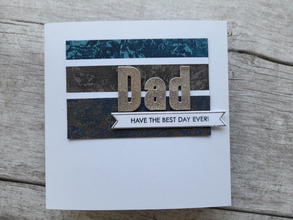 Next was to heat emboss another scrap piece of white card with the ‘metallic platinum’ and then die cut ‘Dad’ using Julie Hickey’s alphabet dies. I then added that to the topper (which I’d attached to a 6×6 card bank) using foam pads, and finished off with one of Julie’s banner die cut ‘birthday messages’.