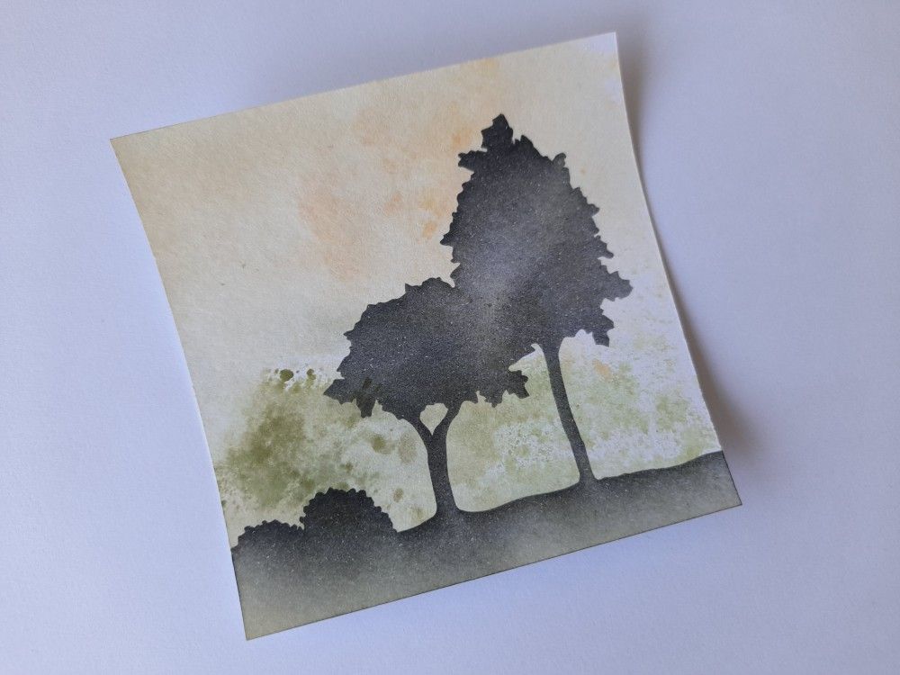 I took one of the peach & green pieces, and laid one of the Claritystamp ‘riverside landscape reflection’ masks onto it.