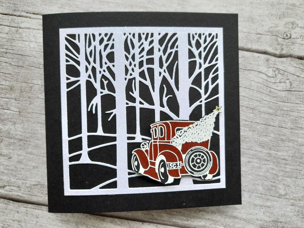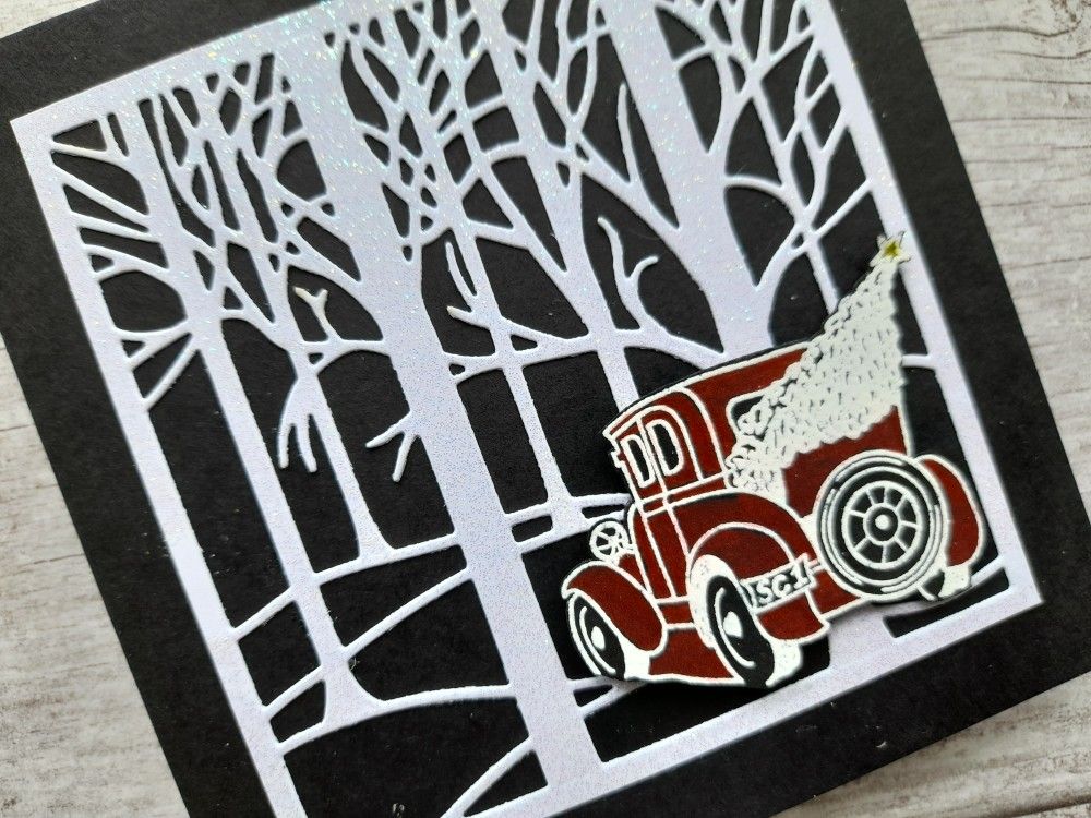 I started with one of my favourite Clarity dies, which I haven’t used for a while – the ‘treescape’. I cut it in white card, and then used a brayer to cover it with WOW clear ink before heat embossing it with clear sparkle powder. You can’t have too much sparkle at Christmas! I popped it onto a black 5×5 card blank so the snowy trees really stand out.