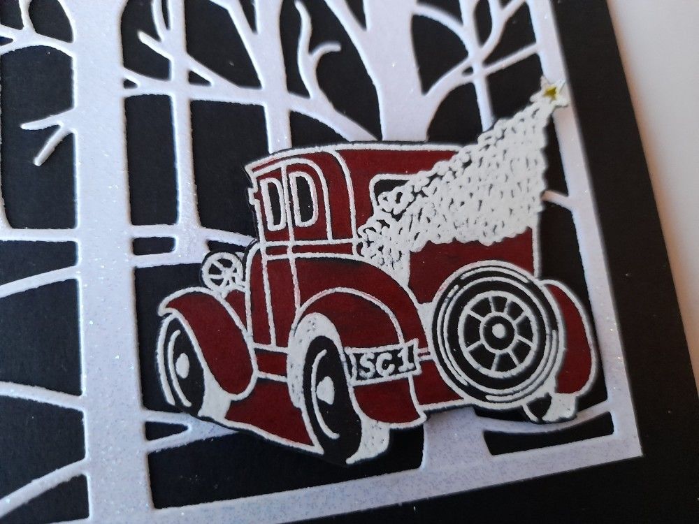 I then stamped ‘Santa’s car’ onto black card and heat embossed it with WOW’s superfine bright white powder. I coloured it red with one of my Spectrum Noir pencils, which worked really well on the black card (and anyway what other colour would Santa have?!). I fussy cut it and then attached the car to the front of the card with a foam pad.