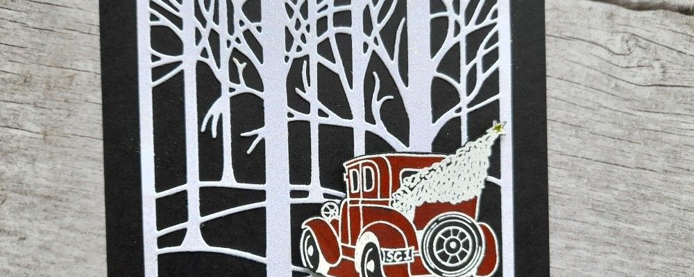 I started with one of my favourite Clarity dies, which I haven’t used for a while – the ‘treescape’. I cut it in white card, and then used a brayer to cover it with WOW clear ink before heat embossing it with clear sparkle powder. You can’t have too much sparkle at Christmas! I popped it onto a black 5×5 card blank so the snowy trees really stand out.