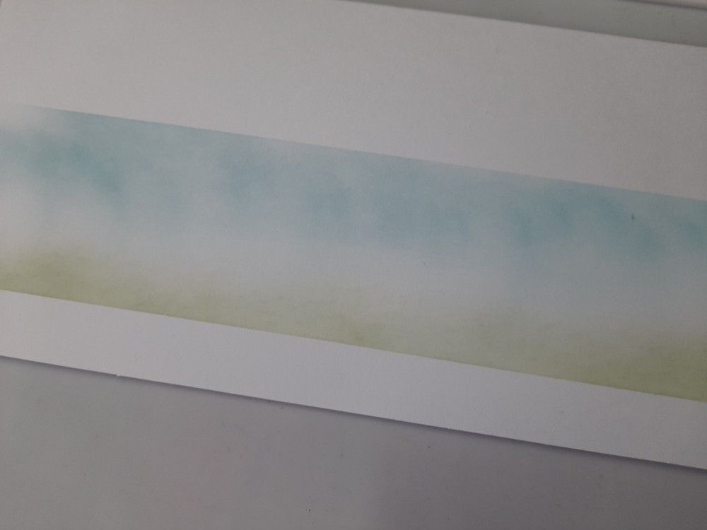 I started with a slimline (DL) card blank, and masked off the top and bottom with low tack tape. Then lightly brushed Distress Oxides in ‘broken china’ and ‘mowed lawn’ along the panel – the green was a bit lighter than I wanted, so I added some ‘iced spruce’ onto it as well.
