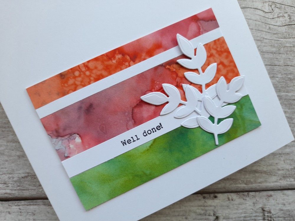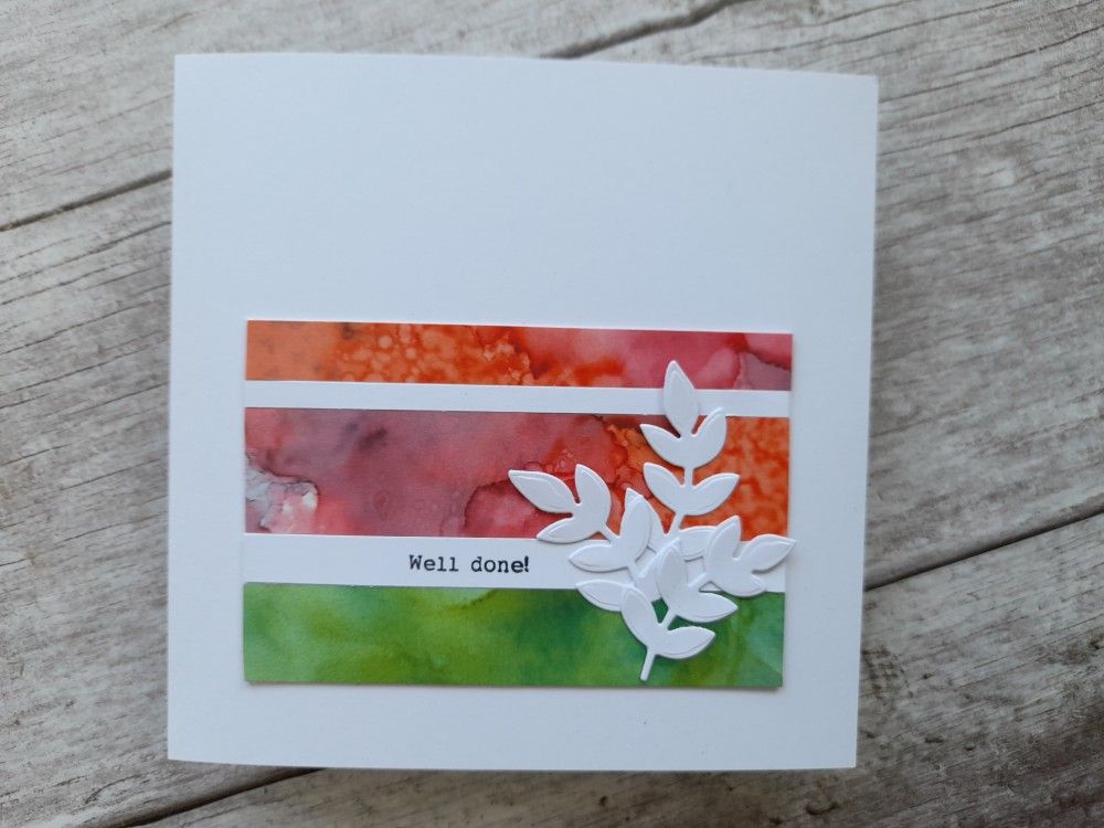 I’ve pulled three challenges together to inspire this little creation (plus my colleague’s news as well, obviously). The colours are lifted from the photo at Inspired by challenges (those melon lollipops just look so juicy!), I used paper strips to build the stripes thanks to Just Add Ink, and finally echoed the stripes and the leafy plant from Time Out challenges‘ photo.
