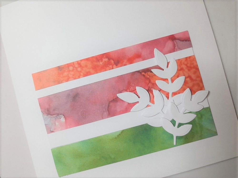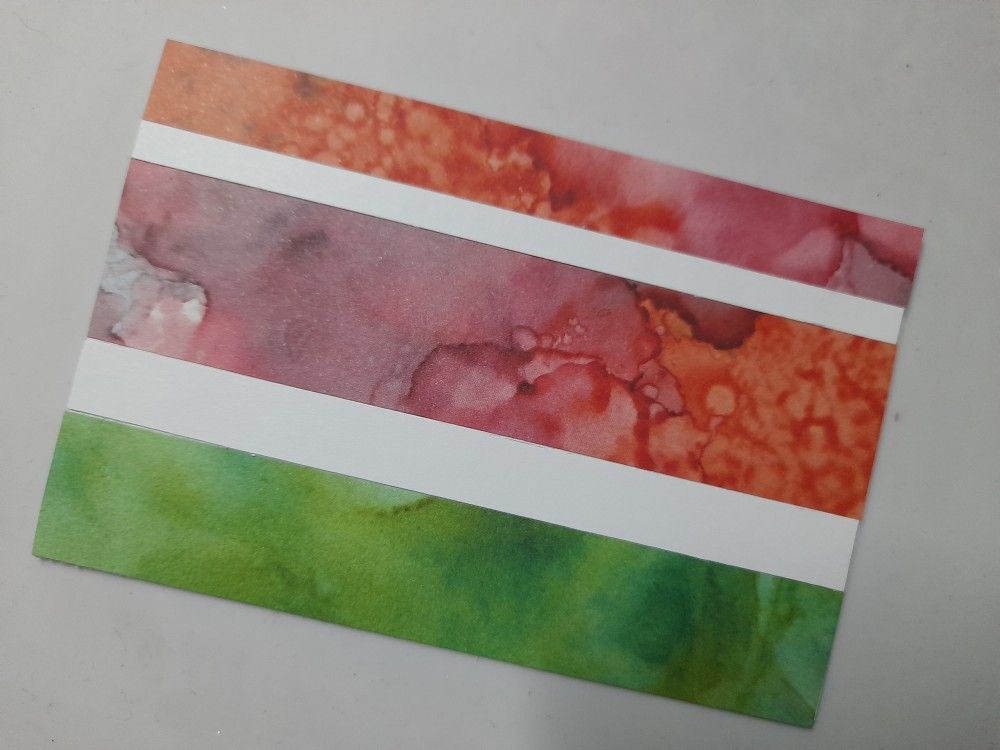 I started by cutting myself a small rectangle of white card to use as a base, and then attached offcut strips of paper (these are Claritystamp designer papers), separated by narrow strips of white. In fact, the red/orange strips are scraps from the card I made on Monday!