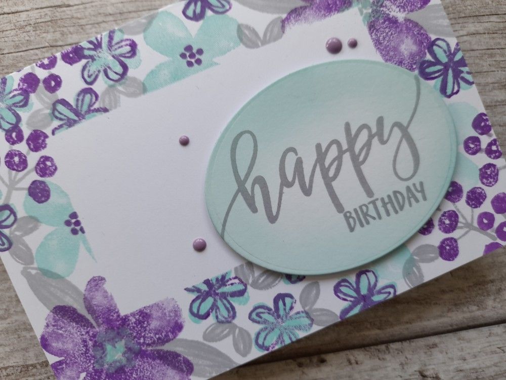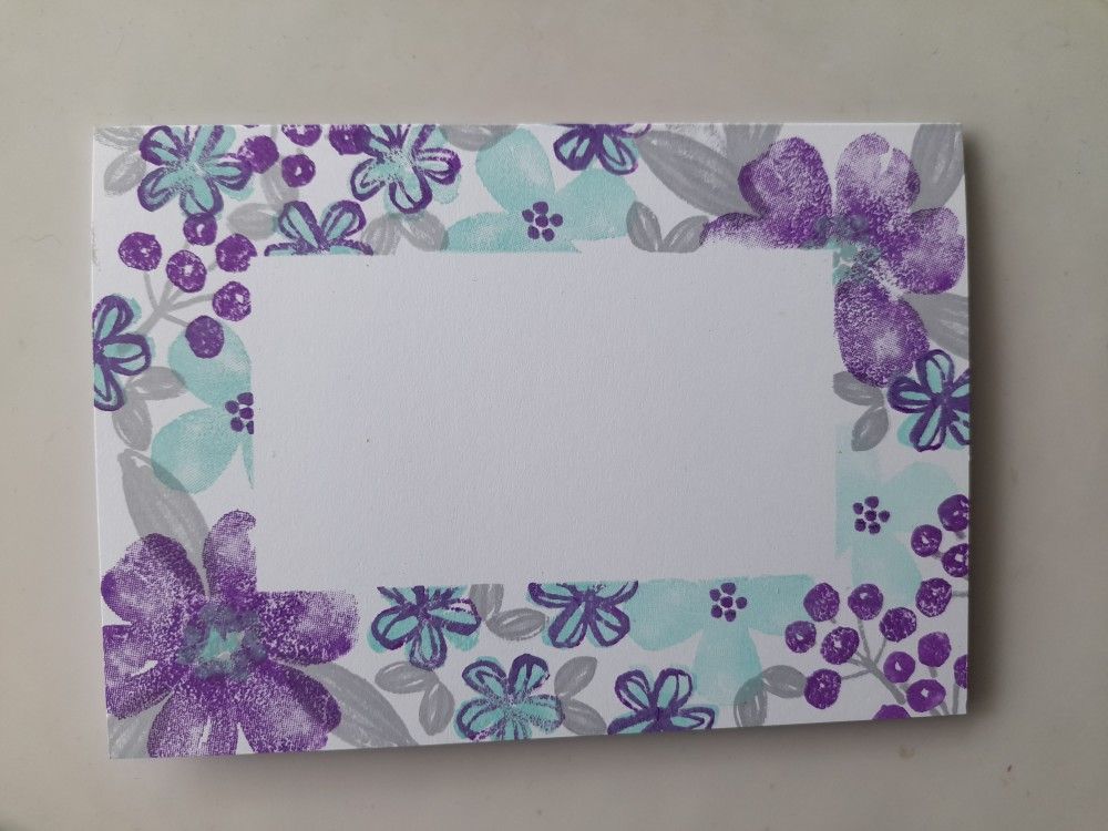 I decided to reverse the sketch and put the flowers around the border, rather than in the centre. I masked an A6 card blank using a sticky note, and stamped the flowers and leaves around the edge using Distress Oxides in ‘wilted violet’ and ‘salvaged patina’, plus ‘shadow grey’ Archival.