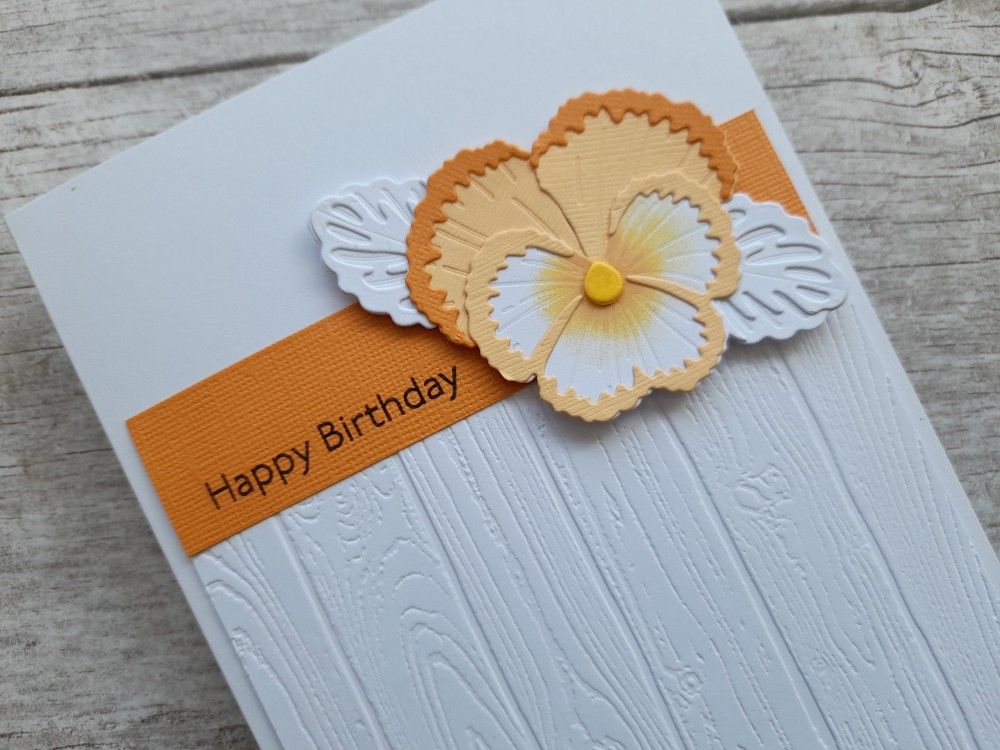 I cut a couple of leaves from white card, and attached them and the pansy onto the orange strip using foam pads.