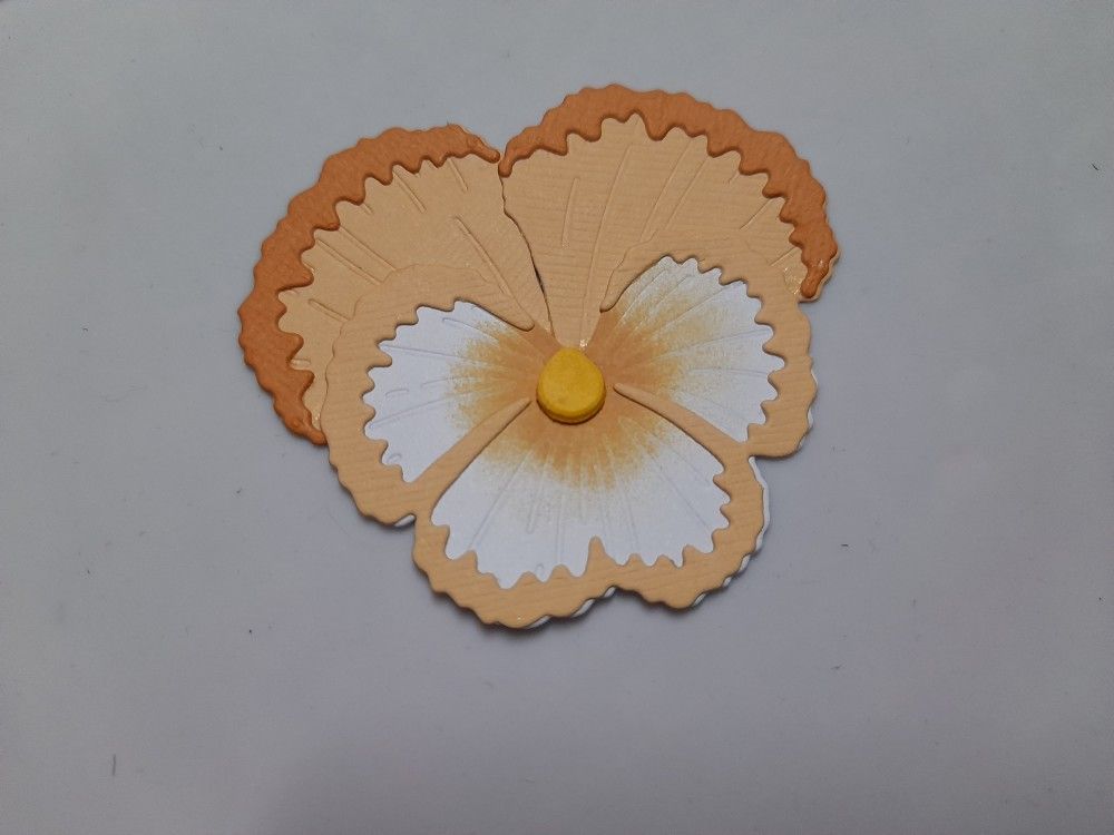 I die cut all the pansy pieces using white, peach and orange card (this is a great way to use up scraps!), and added a little ‘dried marigold’ ink to the centre of the white piece with a sponge before gluing all the pieces together.