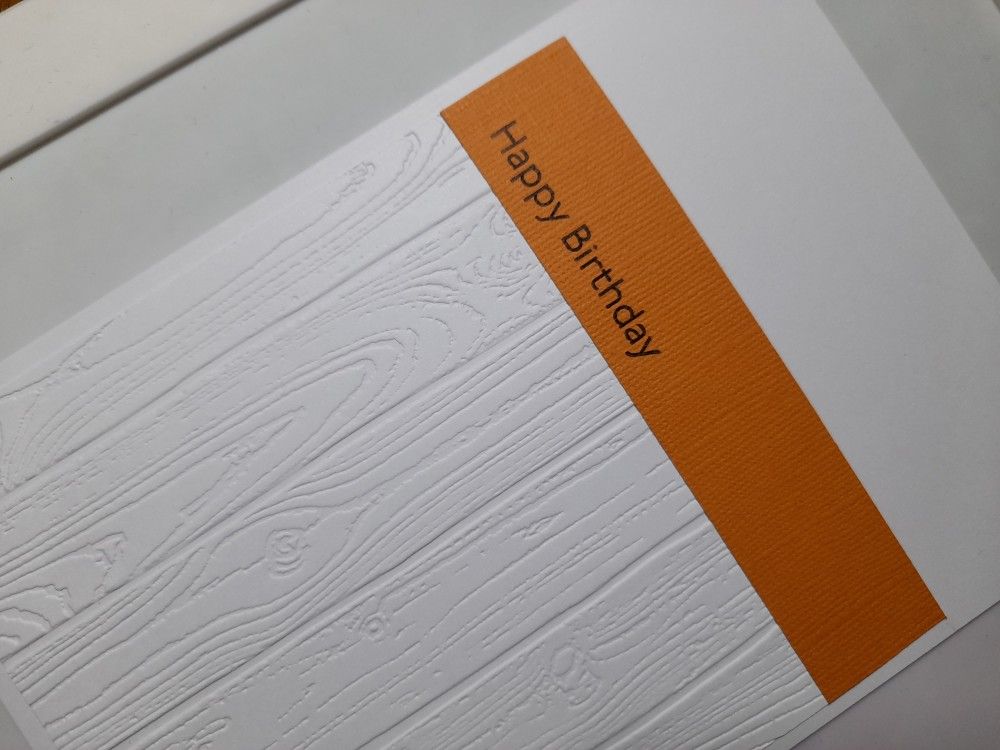I started with a square of white card, which I embossed with the SU ‘pinewood planks’ folder. I then added a strip of orange card across the top of it and attached then to a 5×7 card blank before stamping the sentiment onto the orange card.