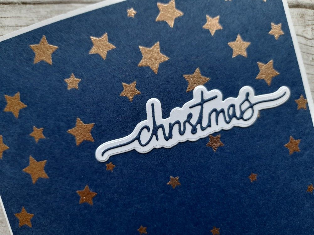 Julie’s just launched some lovely seasonal dies, so I took ‘Christmas’ and die cut the word in navy and the backing in white. All I needed to do was layer the script onto the backing piece and then attach that to the card front.