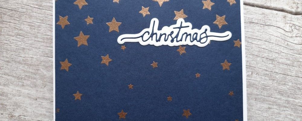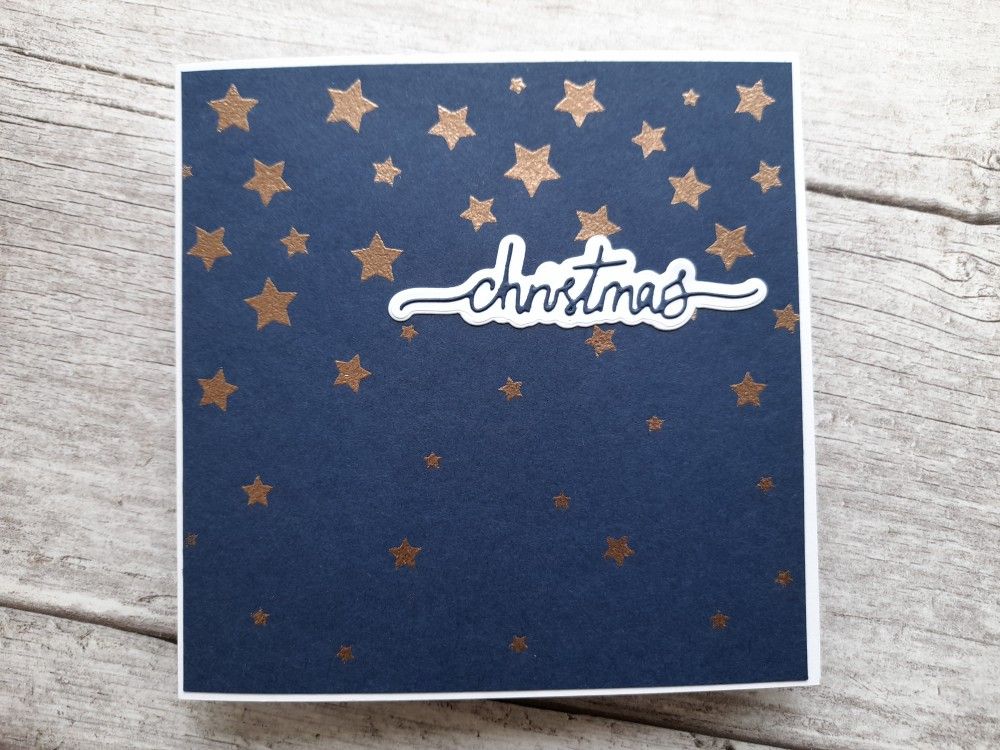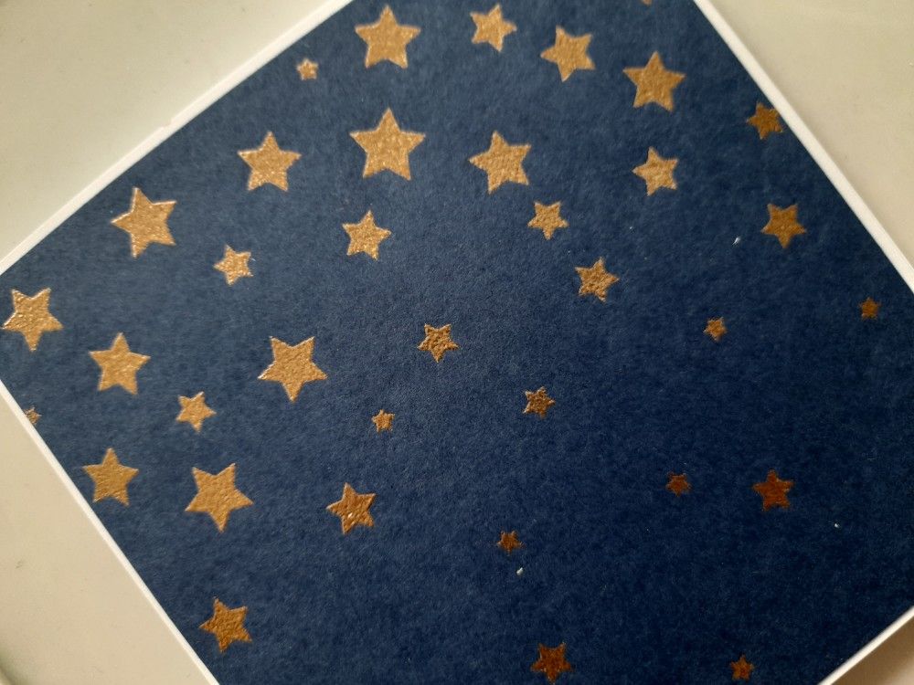 This one is nice and simple, so will be good for batch making. I started with a square of navy card and the stars from Julie Hickey’s background stencils. I just sponged WOW embossing ink through the stencil and then heat embossed the stars with ‘rose gold’ powder.