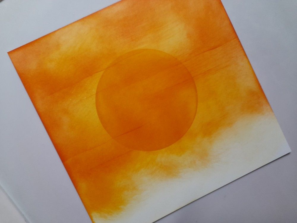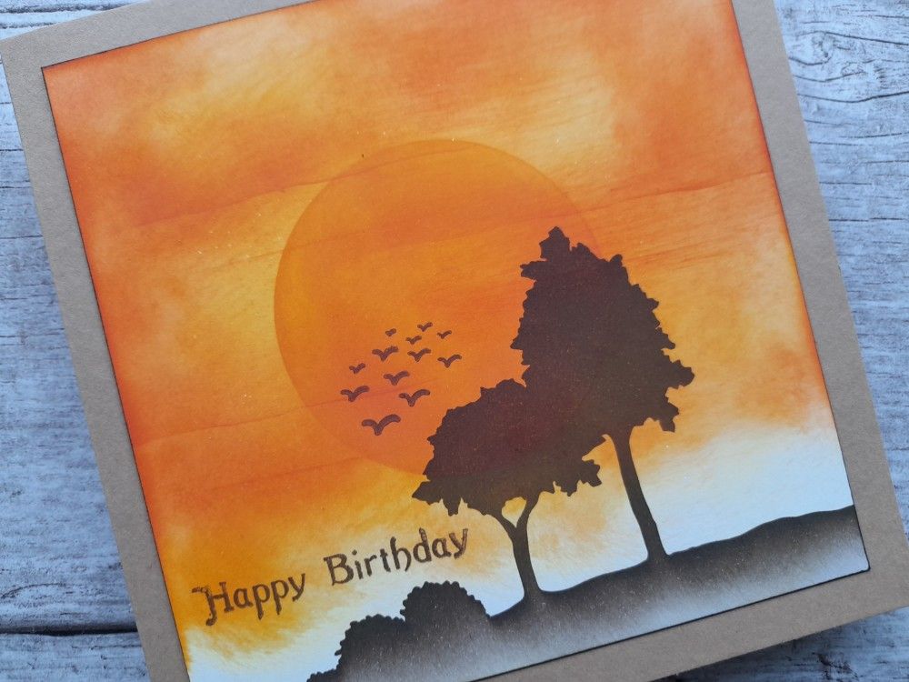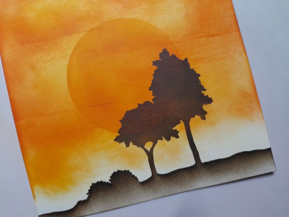 I started with a square of white card, and blended Distress Oxides in ‘mustard seed’ and ‘ripe persimmon’ onto it. I aimed to mix the colours up to get that sunset sky effect, rather than blending them into separate areas for a more ombre look. I added a large sun with one of Clarity’s moon masks, together with some lines to look like evening clouds using the base of one of the landscape masks.