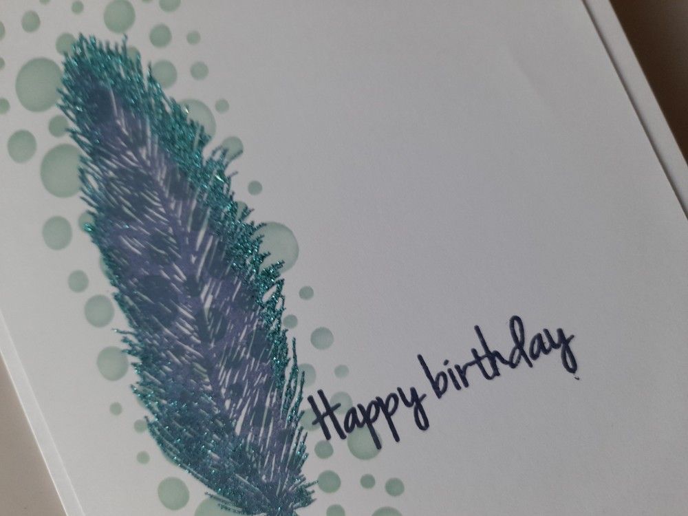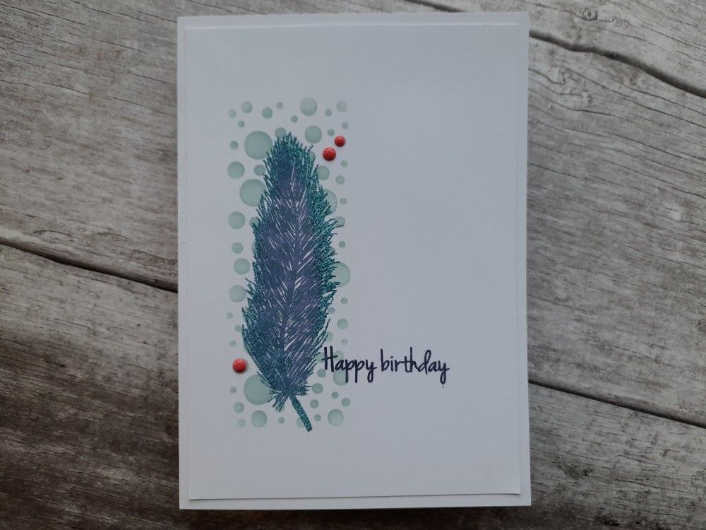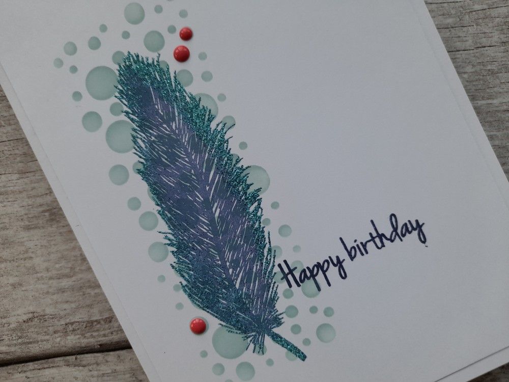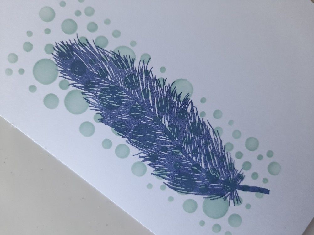 I started with a piece of white card trimmed down to fit a 5×7 card blank, and brushed ‘speckled egg’ Distress Oxide through Claritystamp’s ‘bubbles decorative panel’ stencil to form the background strip. I then stamped the feather in ‘chipped sapphire’ over it and made sure it was fully dry using my heat gun.