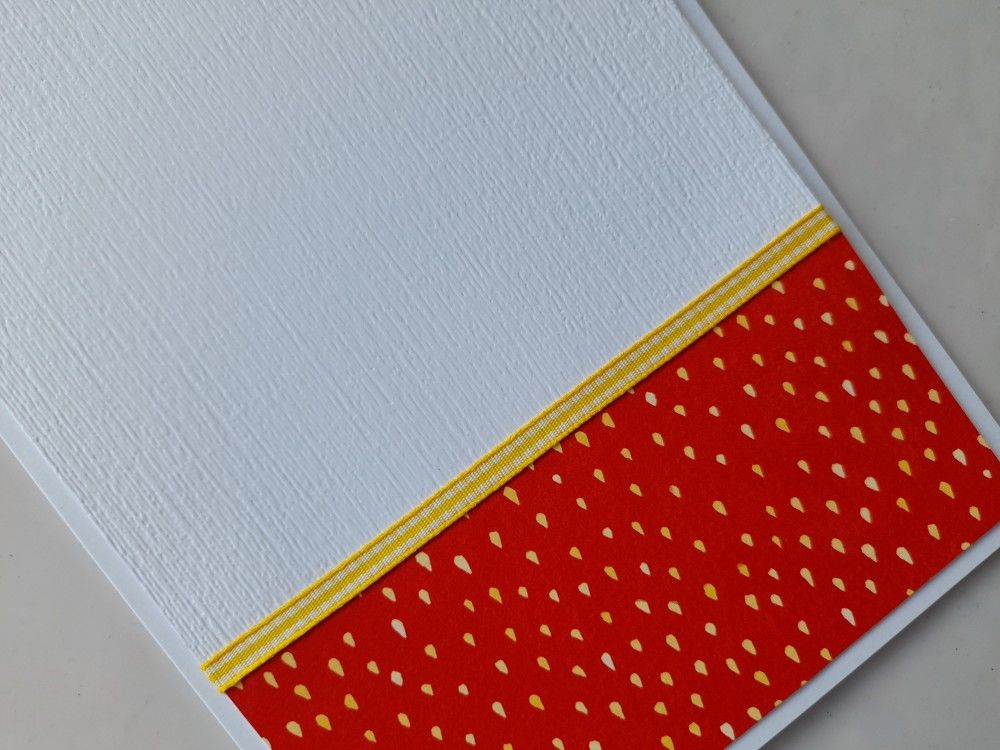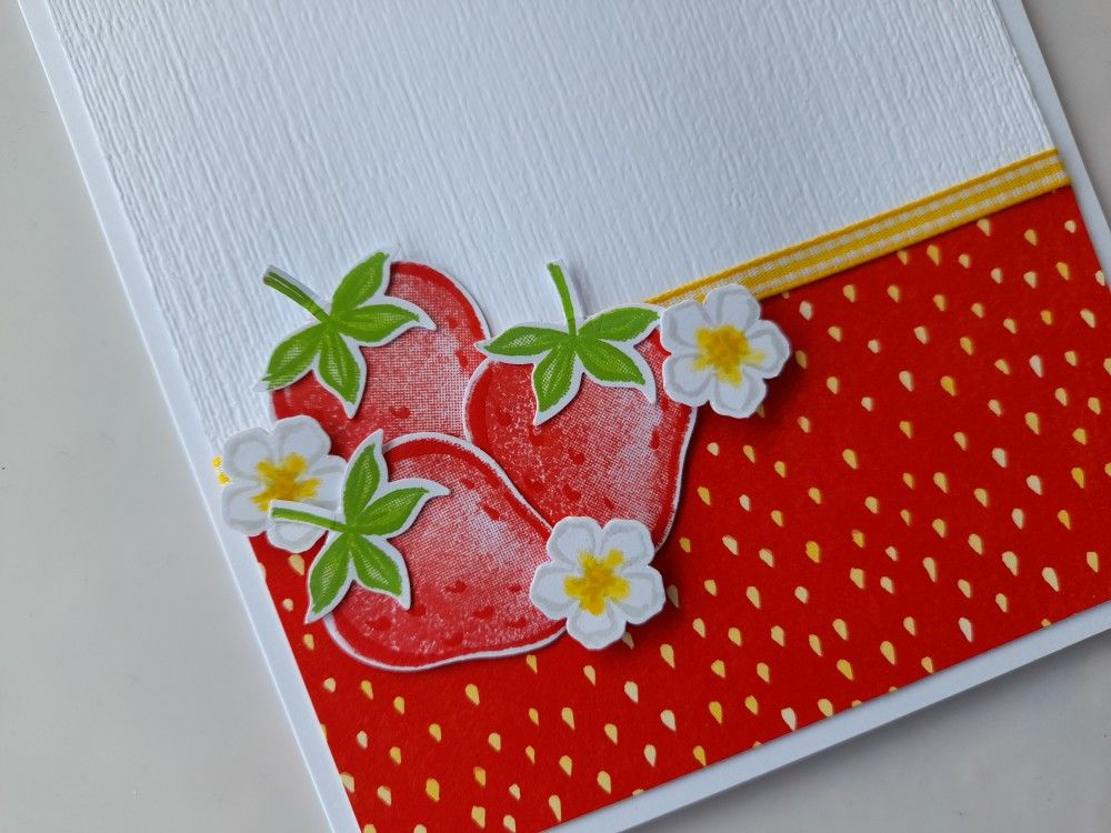 I started by embossing the top part of a piece of white card with Stampin’ Up!’s ‘subtles’ folder, then added a piece of the patterned paper from the berries DSP across the bottom. A strip of narrow yellow gingham ribbon to hide the join and the whole piece then went onto a 5×7 card blank.