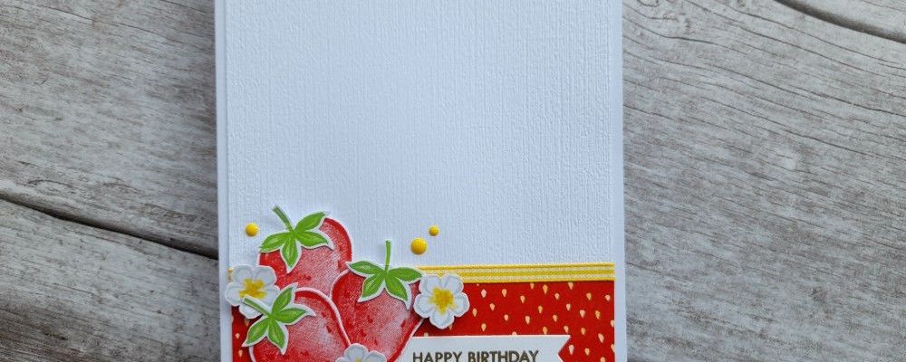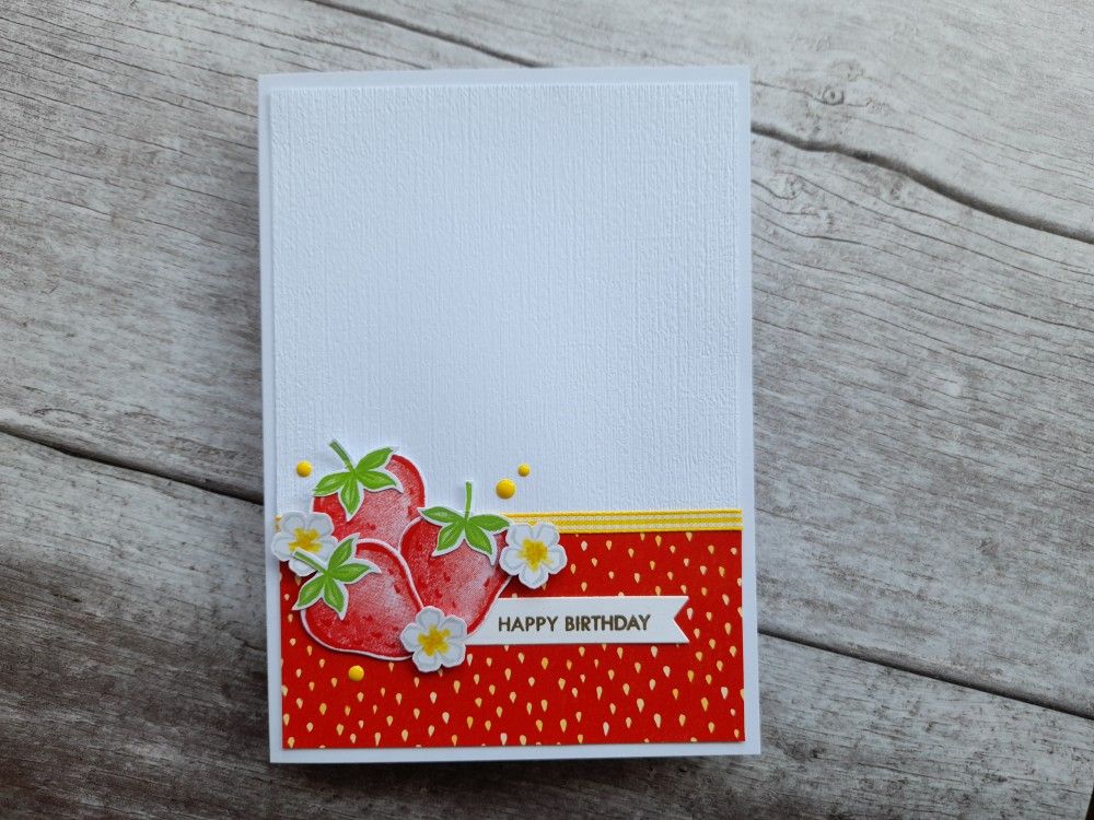 I then stamped and punched out three strawberries and flowers from SU’s ‘sweet strawberry’ set and added then to the card front with foam pads. I’m hoping the team at TicTacToe will treat these as diecuts!
