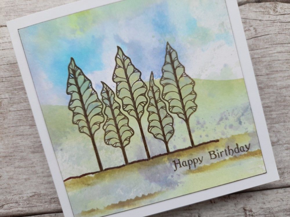 I stamped the row of trees in ‘potting soil’ Archival ink, and added some texture to the foreground by brushing ‘walnut stain’ Distress Oxide across another torn piece of copy paper. I trimmed the background down to fit on a 6×6 card blank.