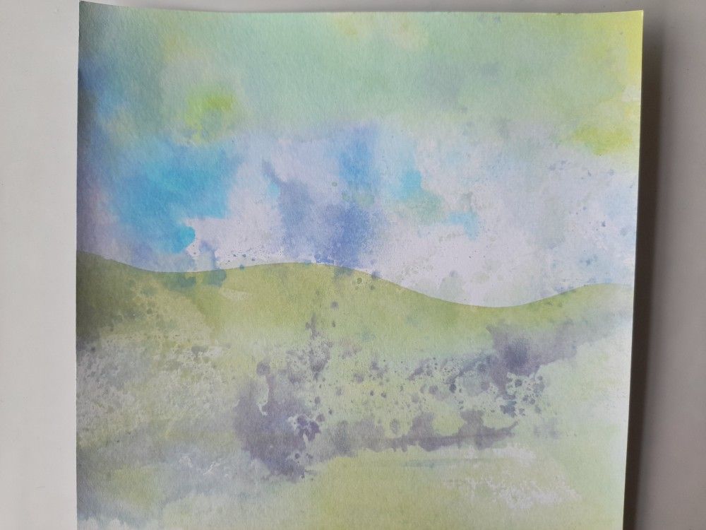 I was delighted to find an inky background in my stash folder that had blues and green on it. I gave it a bit more of a definite horizon by brushing ‘bundled sage’ Distress Oxide across piece fo scrap paper that I’d torn against one of the edges of Clarity’s blending mat.