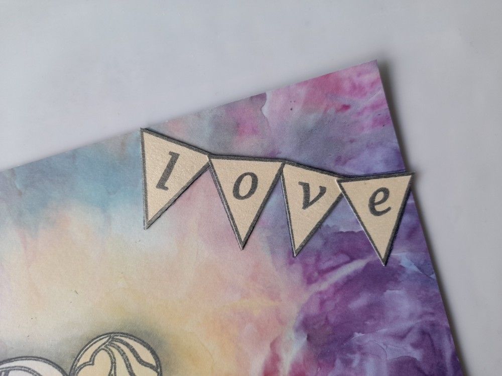 I then stamped the banners that co-ordinate with Clarity’s ‘letterbox’ stamps onto cream card and cut them out. I added ‘love’ onto the banners with the ‘letterbox alphabet’ stamps and glued them onto the designer card.