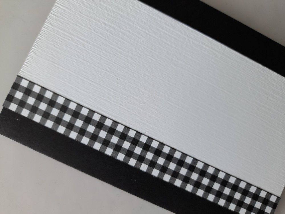 I started by making an A6 card blank from SU’s basic black cardstock, and cut a piece of the basic white card which I ran through the ‘subtle’ embossing folder before attaching it to the card front. I added a strip of a black and white checked retired SU designer paper (can’t remember what this set was called, but the paper’s got large butterflies on the reverse!)