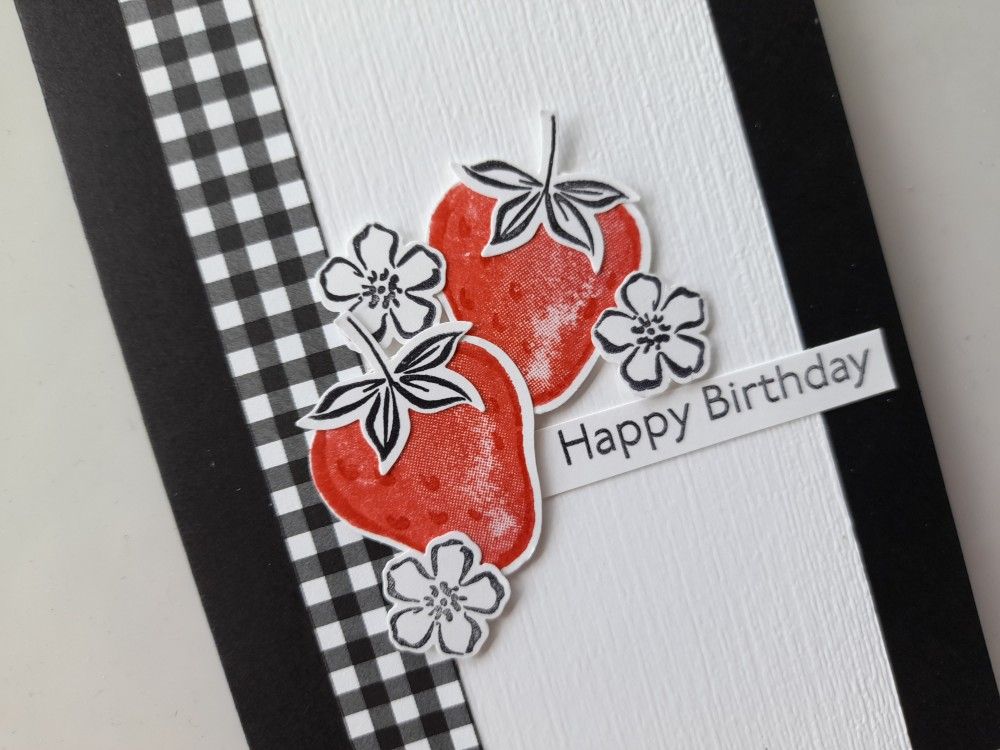 I then stamped & punched out two strawberries with their stalks, and three small flowers. The only SU red I’ve got in my collection is ‘poppy parade’, so I used that rather than the ‘cherry cobbler’ from the challenge. I stamped the strawberry stalks and flowers in black on the basic white card, as I wanted the berries to reflect the focal pop of red in the inspiration photo. I attached them all to the card front with foam pads, and added the sentiment from the ‘Art Gallery’ set.