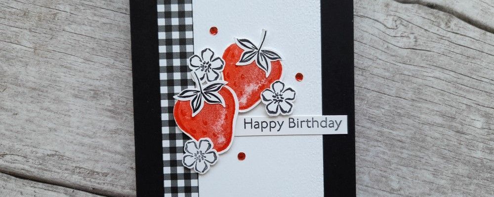 Welcome to my crafty blog and some more delicious strawberries! You’ve no doubt worked out by now that Stampin’ Up!’s ‘sweet strawberry’ set has become a firm favourite and it was an obvious choice when I saw the top row on Joanne’s grid for this week’s TicTacToe challenge. I’ve combined it with the colour scheme from Colour INKspiration, a new-to-me challenge on Facebook