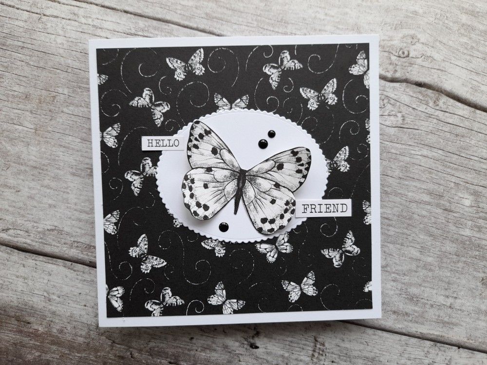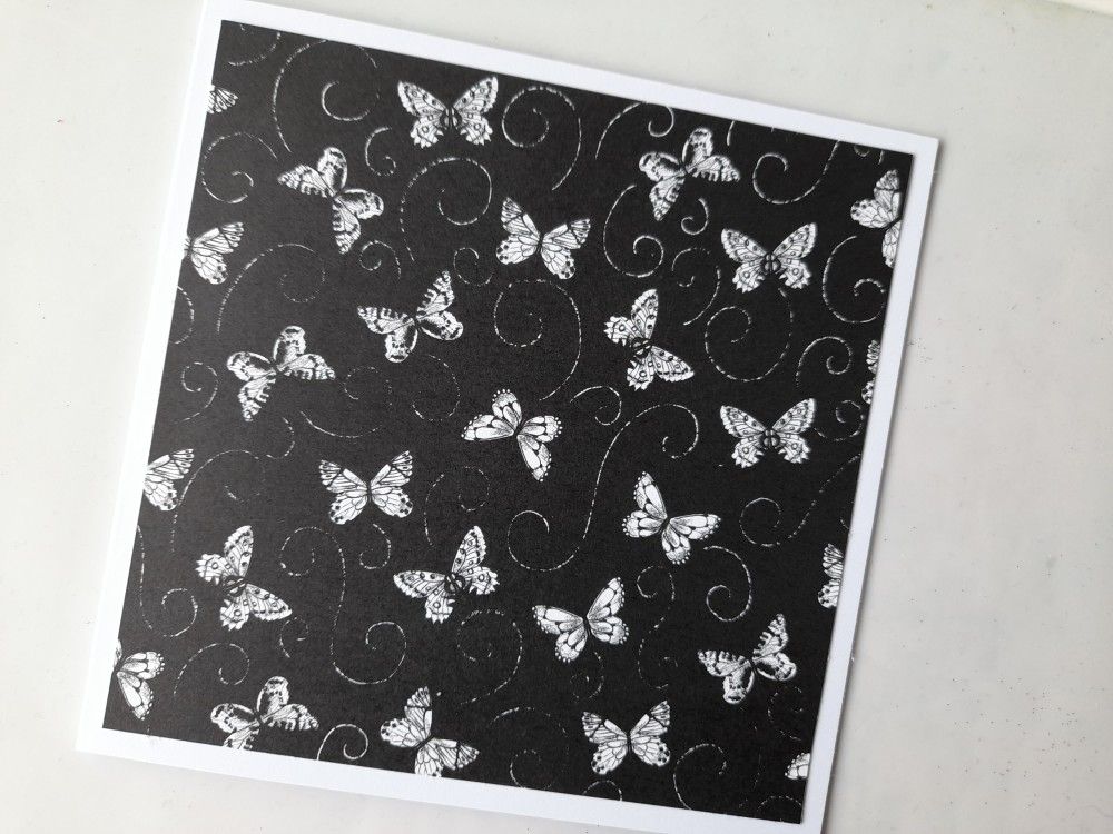I started with a piece of the small black and white butterflies DSP, cut to fit a 6×6 card blank