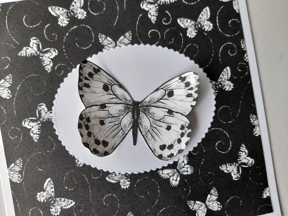Next was to fussy cut one of the large monochrome butterflies from a co-ordinating sheet. I brushed it with Wink of Stella to give it a shimmer (the photo doesn’t pick that up) and attached it to a white oval that I’d die cut. The topper then went on the centre of the card.