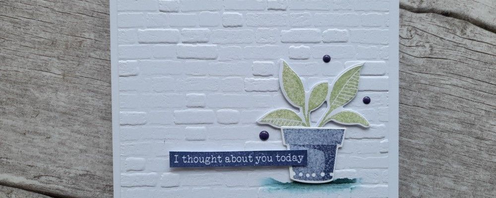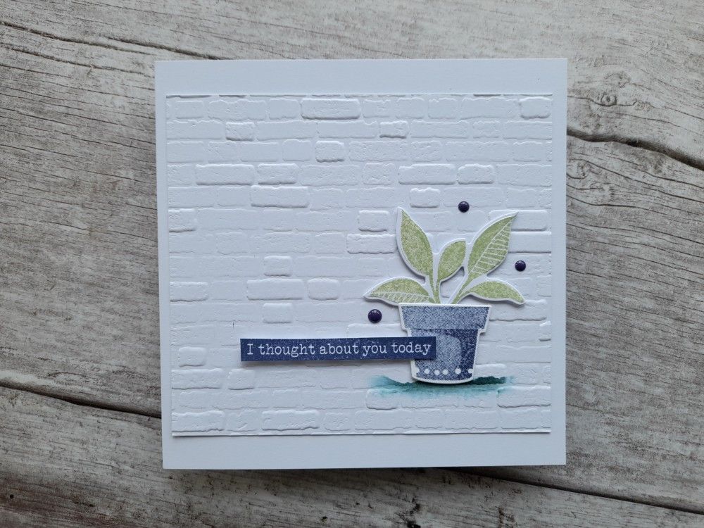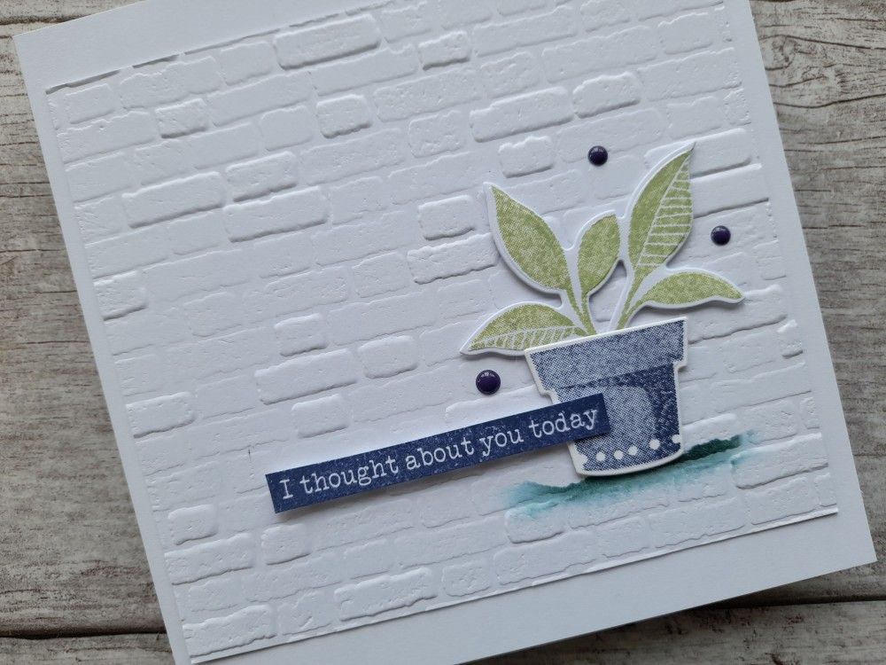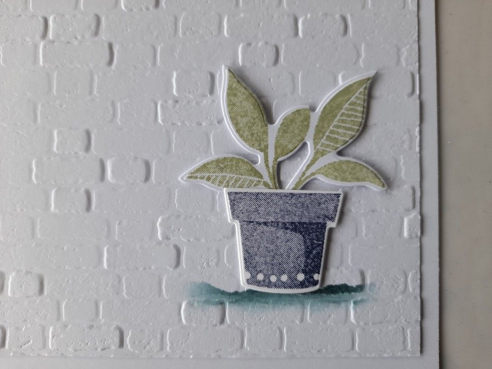 I then stamped one of the plant pots from my new SU ‘plentiful plants’ set, using ‘chipped sapphire’ Distress Oxide and die cut it out. I did the same with the leafy spray after stamping it in ‘bundled sage’. I then used a torn piece of copy paper and a sponge to add some ink to the brick wall, to give my plant pot ground to stand on, and added the pot and leaves using foam pads.