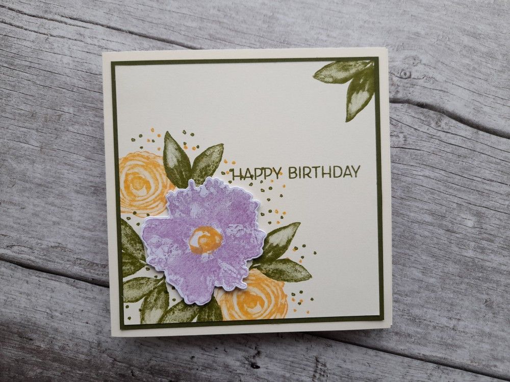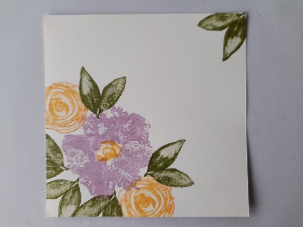 I started by making a 6×6 card blank from SU’s ‘very vanilla’ cardstock, together with a slightly smaller square to stamp on. I stamped the large flower in freesia, then added the two roses in the mango and the leaves in olive. I have to say, building patterns & images like this is so satisfying.