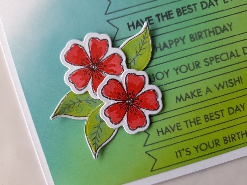 Next was to stamp the two smaller flowers and the single leaves from the ‘fresh florals’ set, again in the ‘watering can’. I coloured them using a waterbrush and ‘festive berries’ & ‘mowed lawn’ Distress Oxides – once dry I die cut them out. I attached the background to a 5×7 card blank, adding the flowers on foam pads to cover the two stamped hearts from the banner outlines and gluing the three leaves around them.