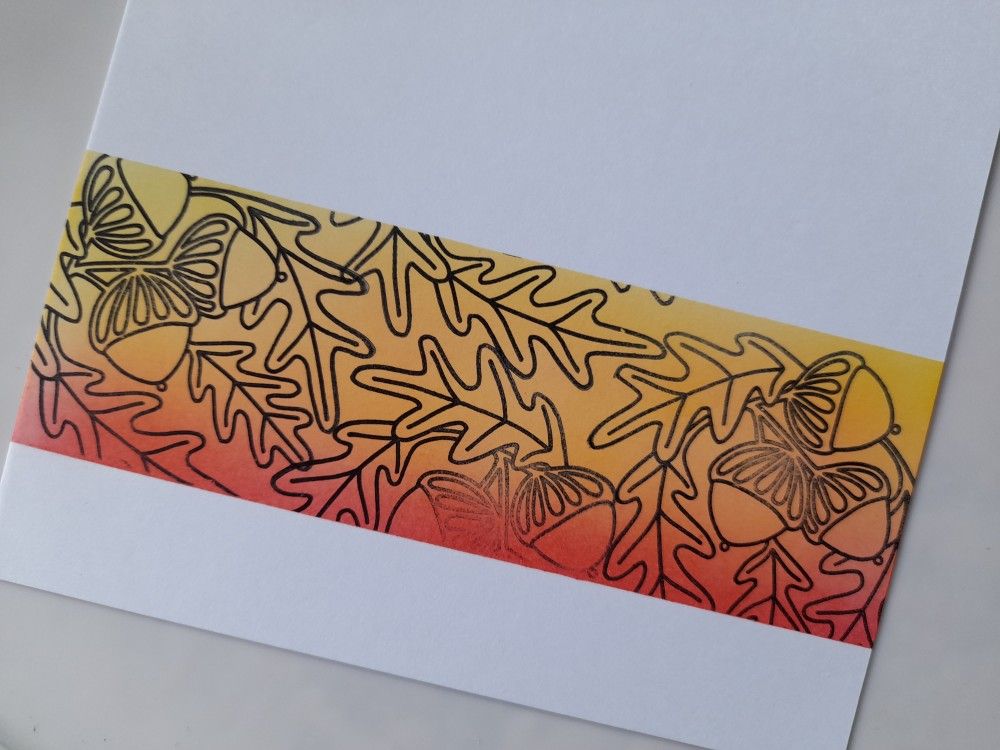 I haven’t made a card with a masked panel for ages and I thought this stamp would work perfectly for one. I started with a square of smooth white card, masked off the panel with low tack tape and blended Distress Oxides in ‘festive berries’ and ‘mustard seed’ across it for some nice autumnal colours. I then repeat stamped the acorns across it.