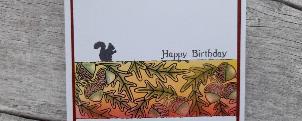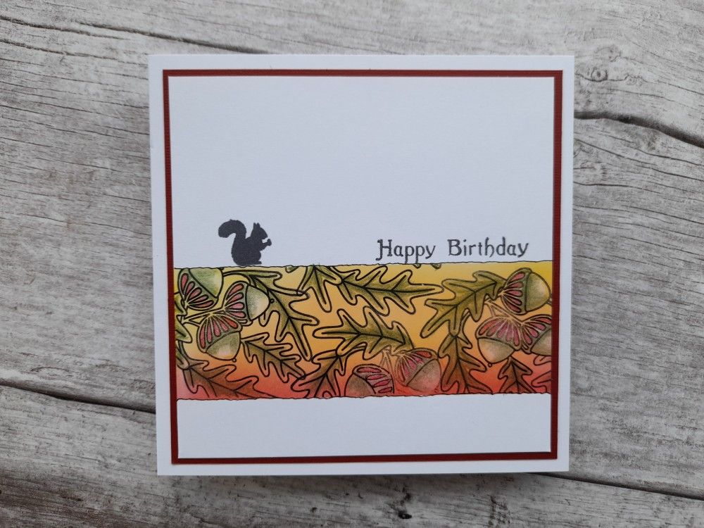 I finished by adding a sentiment and a little squirrel in dark grey – he’s no doubt very excited by the size of those acorns (trying to keep it clean and not comment on the size of his nuts…!)
