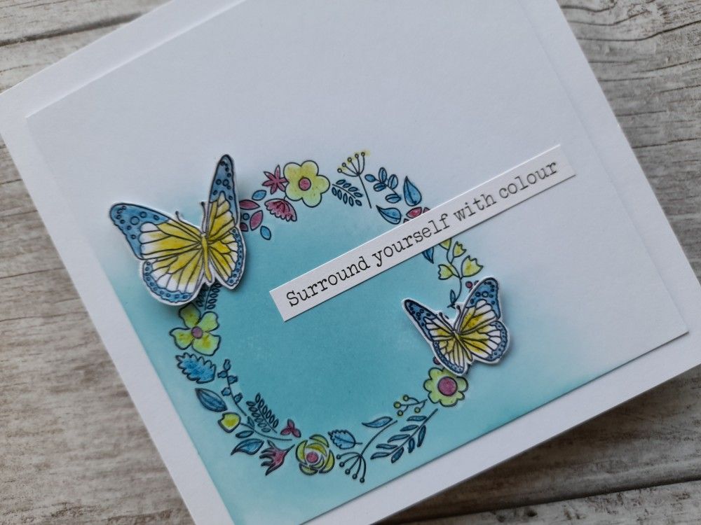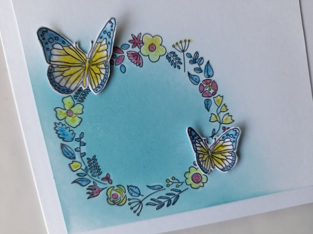 I coloured the wreath using Spectrum Noir pencils and then attached the card to a 5×5 card blank. I stamped both the butterflies on a spare piece of card and shaded them with the pencils before fussy cutting them. I attached them to the wreath with a dab of glue.